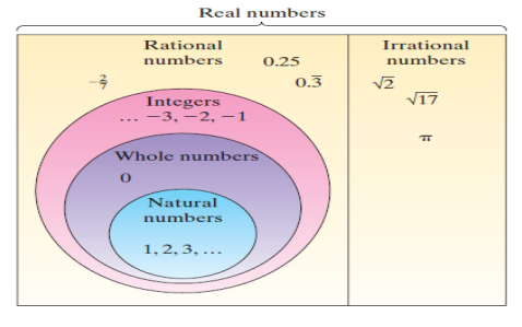 The set of real numbers denoted by \(\Re\) can be described as the union of the set of rational and irrational numbers. i.e \(\Re = \) {\(x : x\) is a rational number or an irrational number}.
